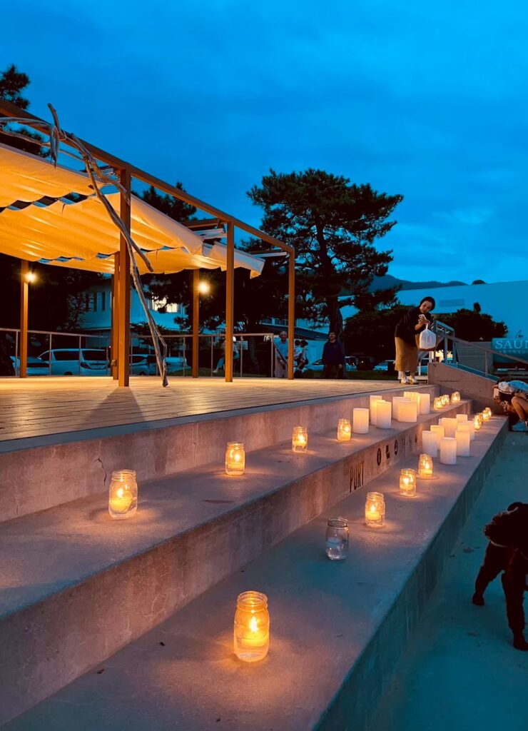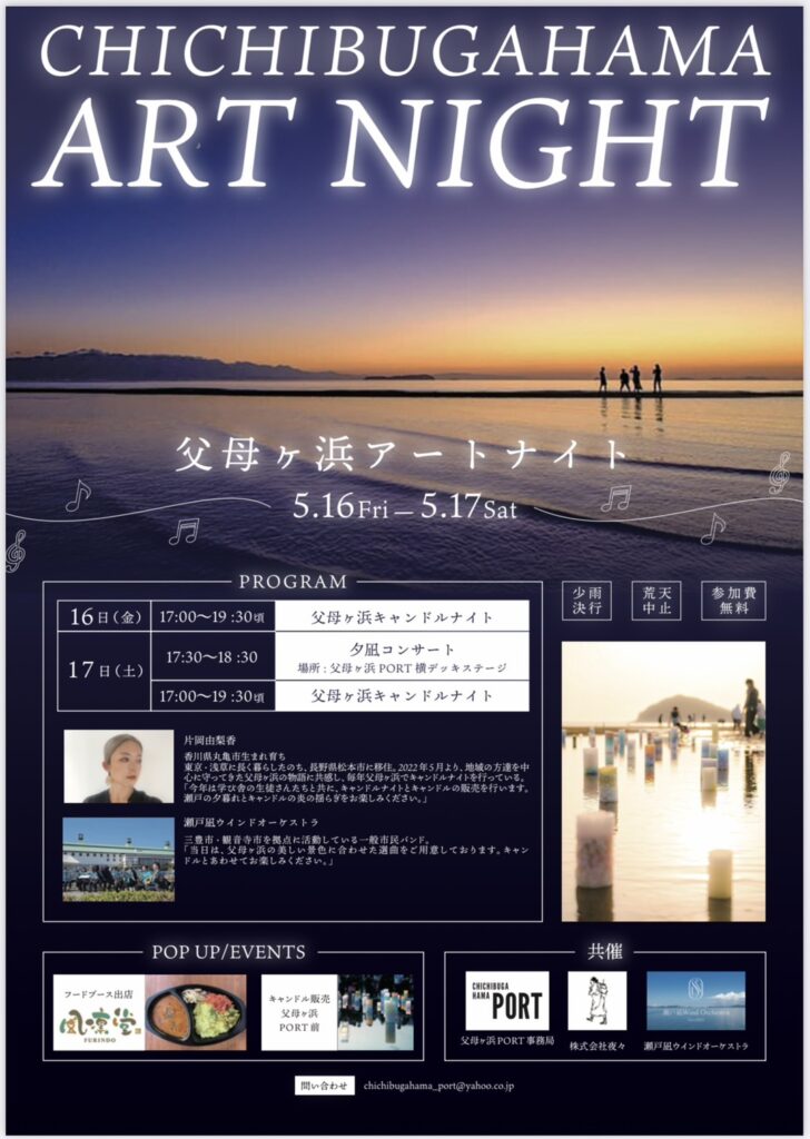 三豊市仁尾町父母が浜にて 夕凪コンサートinキャンドルナイトを行いました。キャンドルナイトが点灯するまでの間、瀬戸凪が海をテーマに、ジャズ、ラテン、ボサノバを中心にお届けしました。県外のお客様にも大好評でした。来年も第2回夕凪コンサートをお楽しみに!